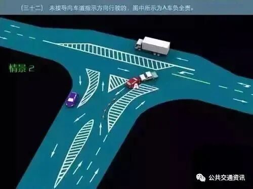 (三十二)情景二:未按导向车道指示方向行驶的,图中所示为A车负全责。