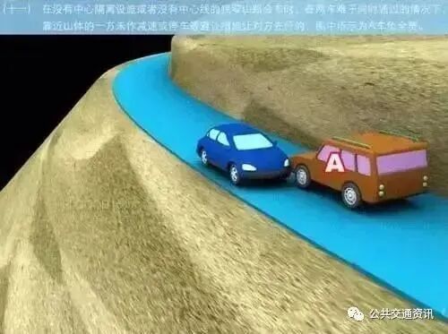 (十一)在没有中心隔离设施或者没有中心线的狭窄山路会车时,在两车难于同时通过的情况下,靠近山体的一方未做减速或停车等避让措施让对方先行的,图中所示为A车负全责。