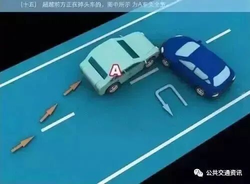 (十五)超越前方正在掉头车的,图中所示为A车负全责。