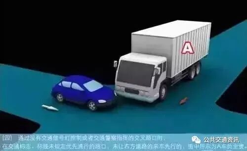 (三)通过没有交通信号灯控制或者交通警察指挥的交叉路口时,未让交通标志、交通标志线规定优先通行的一方先行的,图中所示为A车负全责。