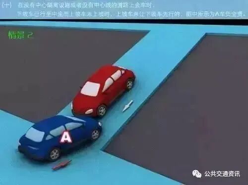(十)情景二:在没有中心隔离设施或者没有中心线的道路上会车时,下坡车已行至中途而上坡车未上坡时,上坡车未让下坡车先行的,图中所示为A车负全责。