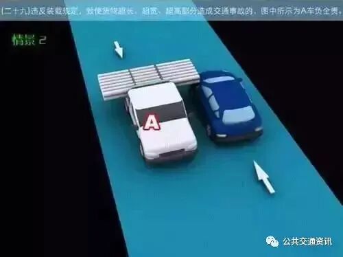 (二十九)情景一:违反装载规定,致使货物超长、超宽、超高部分造成交通事故的,图中所示为A车负全责。