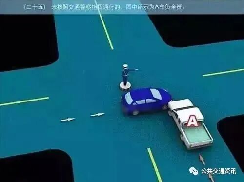 (二十五)未按照交通警察指挥通行的,图中所示为A车负全责。