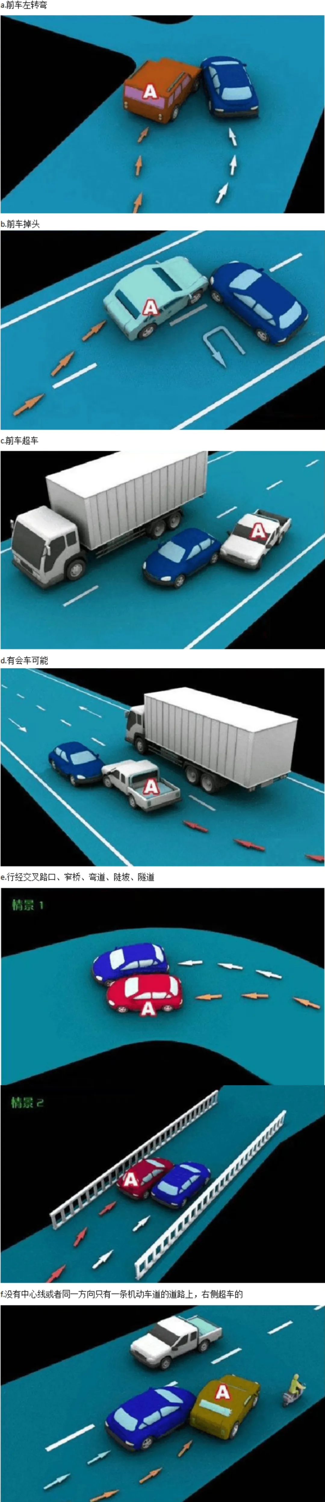 【法律依据】《中华人民共和国道路交通安全法》第四十三条第一项:同车道行驶的机动车,后车应当与前车保持足以采取紧急制动措施的安全距离。有下列情形之一的,不得超车:(一)前车正在左转弯、掉头、超车的;(二)与对面来车有会车可能的;(三)前车为执行紧急任务的警车、消防车、救护车、工程救险车的;(四)行经铁路道口、交叉路口、窄桥、弯道、陡坡、隧道、人行横道、市区交通流量大的路段等没有超车条件的。