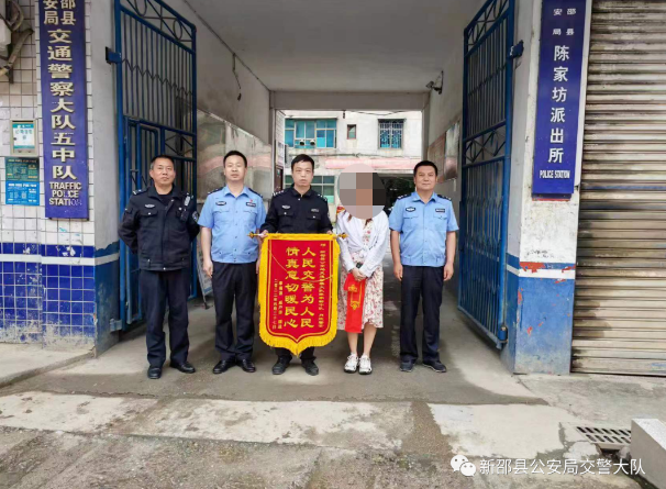 5月27日上午10时许,新邵县雀塘镇枫树村村民李女士将一面印有“人民交警为人民 情真意切暖民心”的锦旗送到新邵县公安局交警大队陈家坊中队,对中队民警通过分析研判和深入摸排,成功侦破“2022.5.20”交通事故案表示感谢。